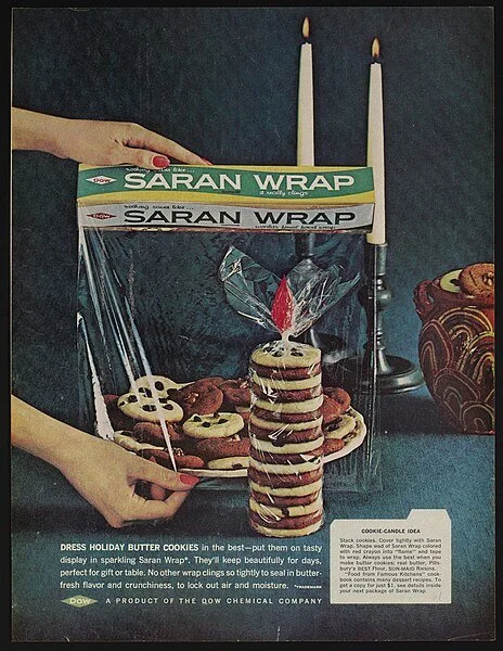 However, the wonderful new invention didn't finally find its true calling until the late 1940's when Ralph finally managed to create the same product without the shitty green color and terrible odor. In 1949, he used this new formulation to create the famous clingy plastic wrap known as Saran Wrap that for so long kept all of our leftovers fresh. Now at the time, there were many other plastic wraps on the market, but Saran Wrap, thanks to the formulation of PVDC, had a couple distinct advantages. One was the fact that it would stick to practically anything. The second was that it was less permeable, meaning that it let in less oxygen, therefore cutting down on food rot, while at the same time letting out less food odors, meaning that saving some French Onion soup wouldn't stink up your entire refrigerator. The new product proved immensely popular, and it wasn't long before it could be found in every household in America.